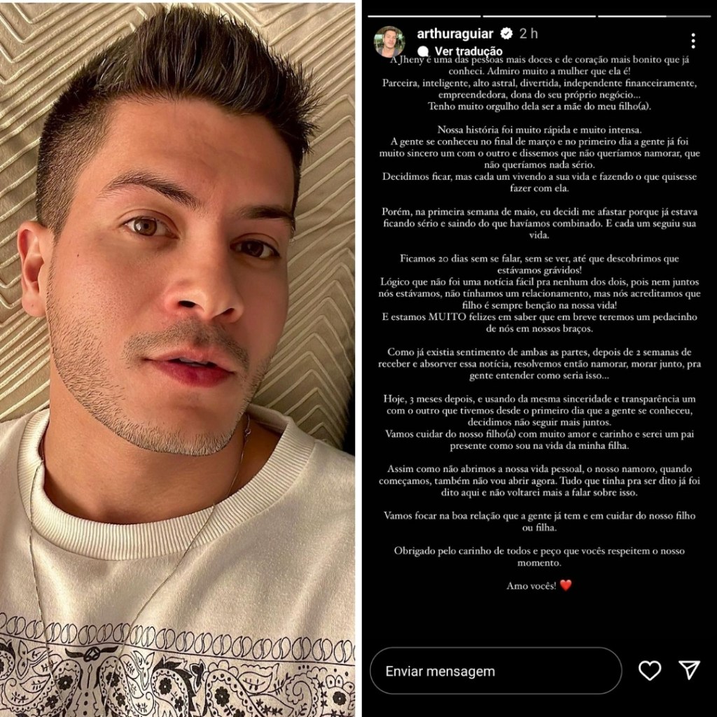 Na semana passada, o ex-BBB tornou pública a gravidez de sua então namorada, Jheny Santucci. Em uma postagem recente, Arthur compartilhou detalhes sobre o início de seu relacionamento com Jheny e revelou que estavam separados quando descobriram a gestação.