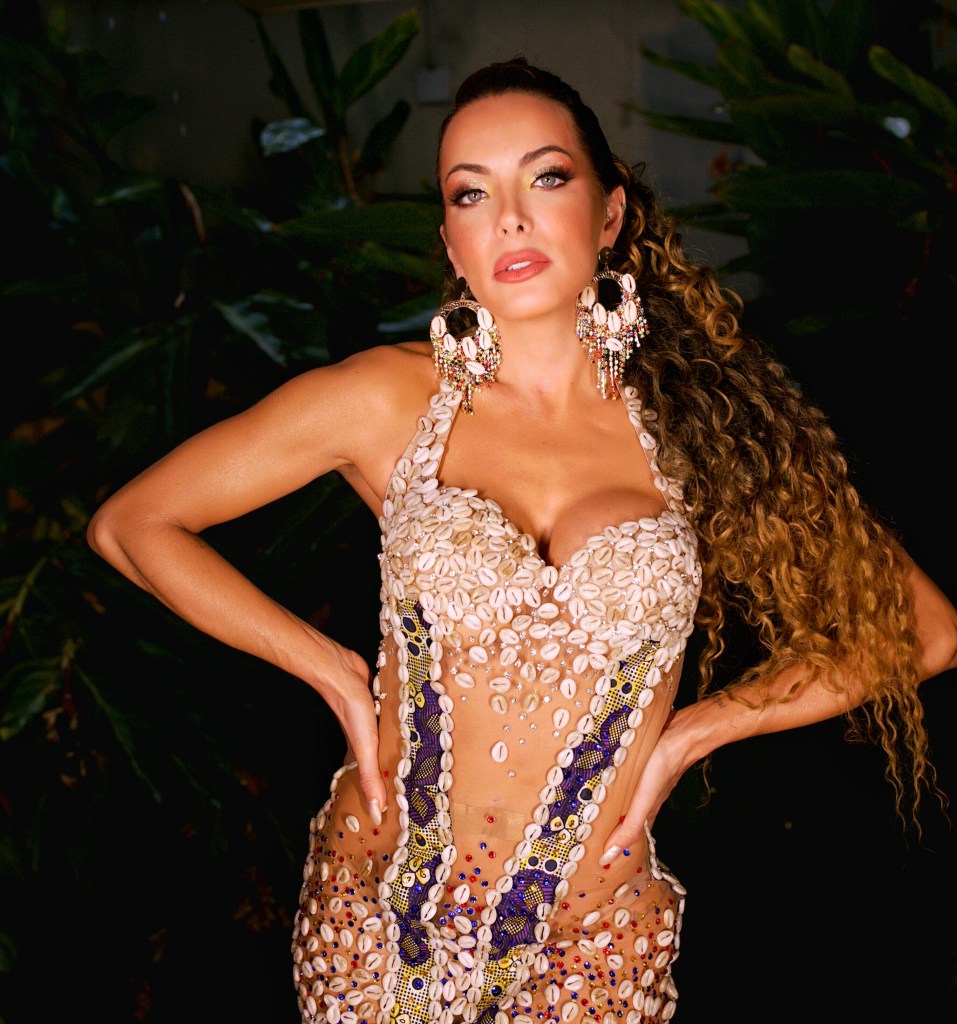 Vestida com elegância, a apresentadora exibiu um vestido ousado, adornado com búzios e pedrarias em tons de vermelho e azul, ressaltando sua sensualidade. A maquiagem e o cabelo, assinados por Wellington Montanha, integrante da agremiação, realçaram ainda mais a beleza natural de Carla Prata, incluindo uma deslumbrante trança e cachos cuidadosamente elaborados.