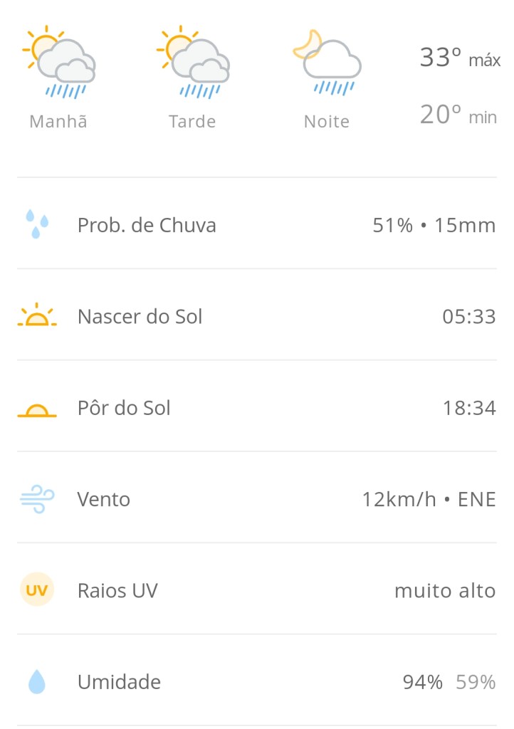A previsão do tempo para esta segunda-feira na cidade de Aparecida de Goiânia indica uma mistura de sol com algumas nuvens, com períodos de chuva rápida ao longo do dia e à noite. As temperaturas variarão entre 20 e 33 graus Celsius, com possibilidade de chuva durante todo o dia.