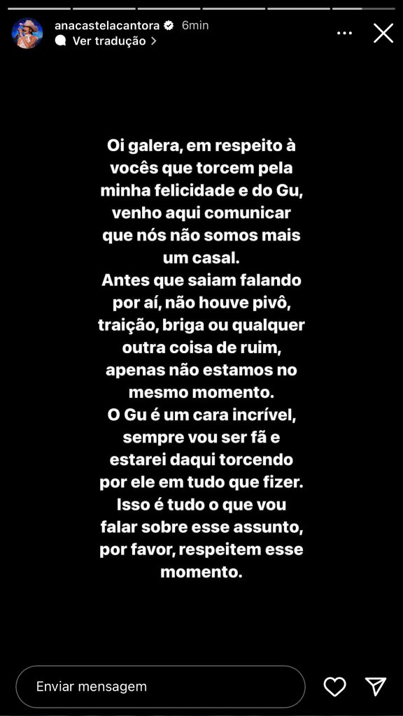 Nos stories do Instagram, a Boiadeira escreveu: “Oi galera, em respeito à vocês que torcem pela minha felicidade e do Gu, venho aqui comunicar que nós não somos mais um casal”, disse ela.
