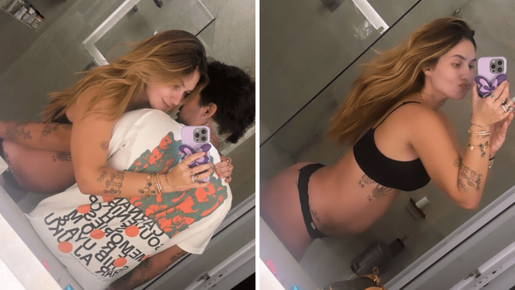 A influenciadora Virginia Fonseca, de 25 anos, compartilhou momentos íntimos com seu marido, o cantor Zé Felipe, de 26 anos, em registros no banheiro de sua mansão. Antes de tomar banho, Virginia exibiu sua barriga de 7 meses de gestação para seus mais de 47 milhões de seguidores no Instagram, apenas de lingerie preta.