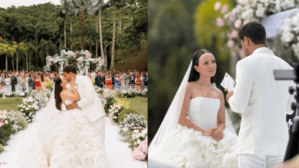 O vídeo exibe a entrada do casal e a emoção dos convidados, culminando na troca de votos e alianças. Larissa, radiante, usou um vestido clássico branco com decote tomara que caia e saia armada, complementado com um véu sutil. Já André Luiz estava elegante em um terno off white, com gravata borboleta e relógio. “Nossa benção matrimonial“, escreveu a atriz na legenda.