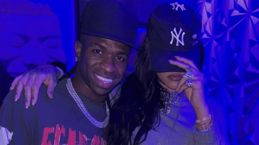 Vini Jr, eleito o Melhor Jogador do Mundo pela FIFA em dezembro, aproveitou as férias em grande estilo em Nova York, Estados Unidos. Durante uma festa na cidade, o atleta encontrou a cantora Rihanna e registrou o momento com uma foto, que foi compartilhada em seu perfil no Instagram.