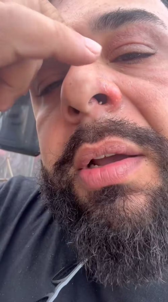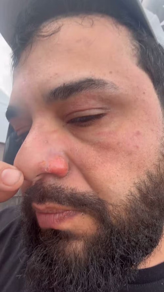 Nas redes sociais, Léo compartilhou vídeos exibindo de perto os ferimentos. “Queimou aqui tudo”, disse o cantor, apontando para a região do olho e da bochecha. “Aqui queimou doído”, acrescentou, mostrando o nariz ferido. Segundo ele, a orelha também foi atingida.