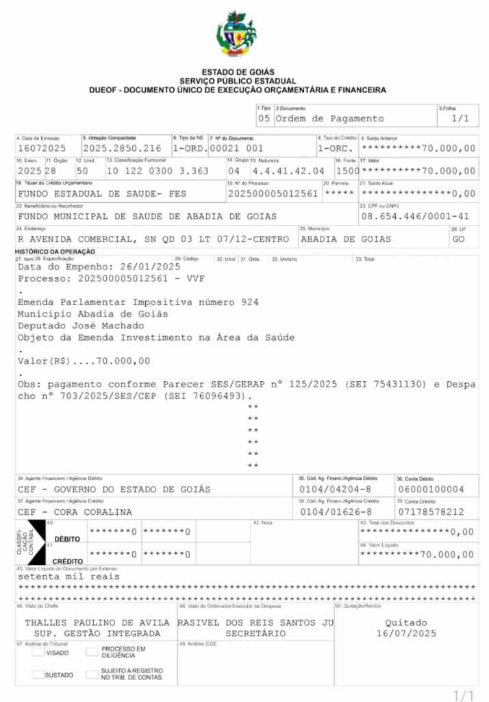 Abadia de Goiás recebeu um importante reforço financeiro para a área da saúde. O deputado estadual José Machado destinou uma emenda parlamentar no valor de R\$ 70 mil, que já foi quitada no último dia 16 de julho, para fortalecer os atendimentos e serviços prestados à população do município.